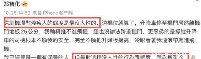 白眼狼事件 事件的起因是,前两天残疾歌手郑智化在自己的社交平台上发布了一条批评信息,主要是批评深圳机场“无人性”。 他在文中写了对深圳机场的强烈不满,还表示他的轮椅推不进飞机,腿也没法跨进机门,这种情况下根本就没有人在意他的安危。