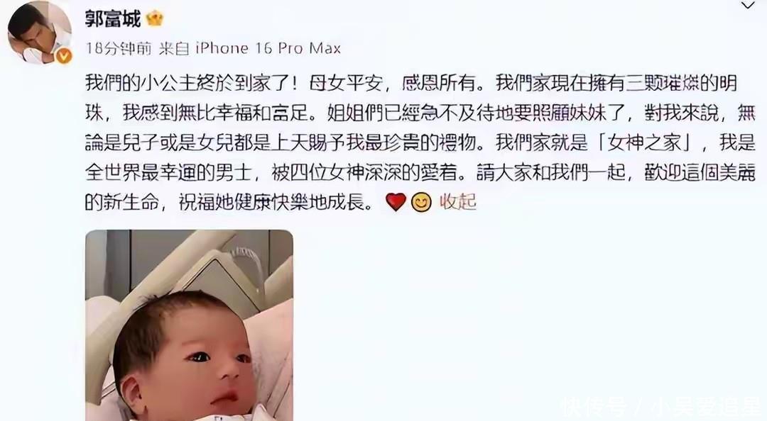 天王郭富城家添了三胎,还是个千金,本该是喜事,结果网上直接炸了锅!不到两天,各种酸话、冷嘲热讽全来了,活像自家亲戚在饭桌上指指点点:"生仨闺女,没儿子可咋整?"